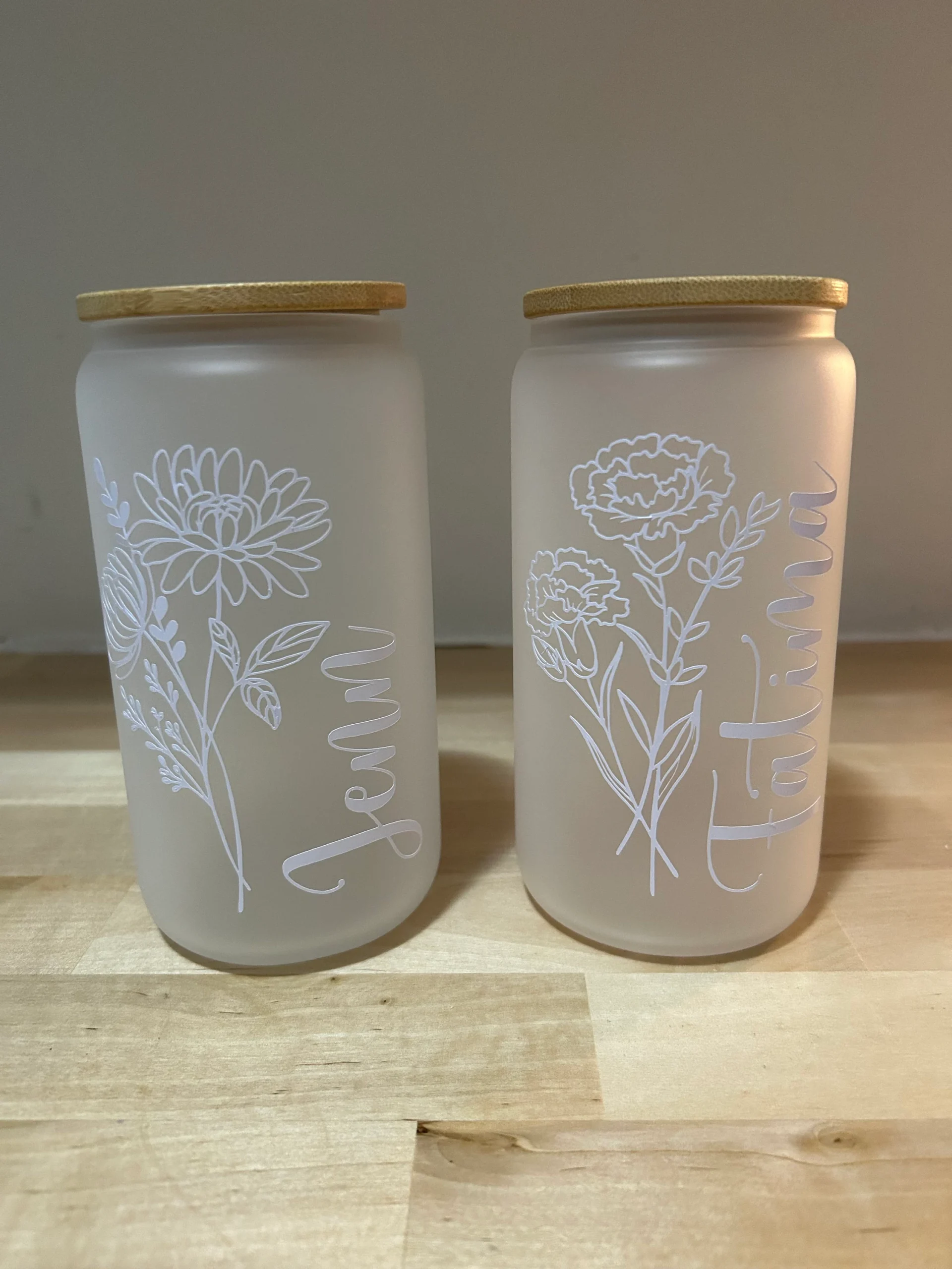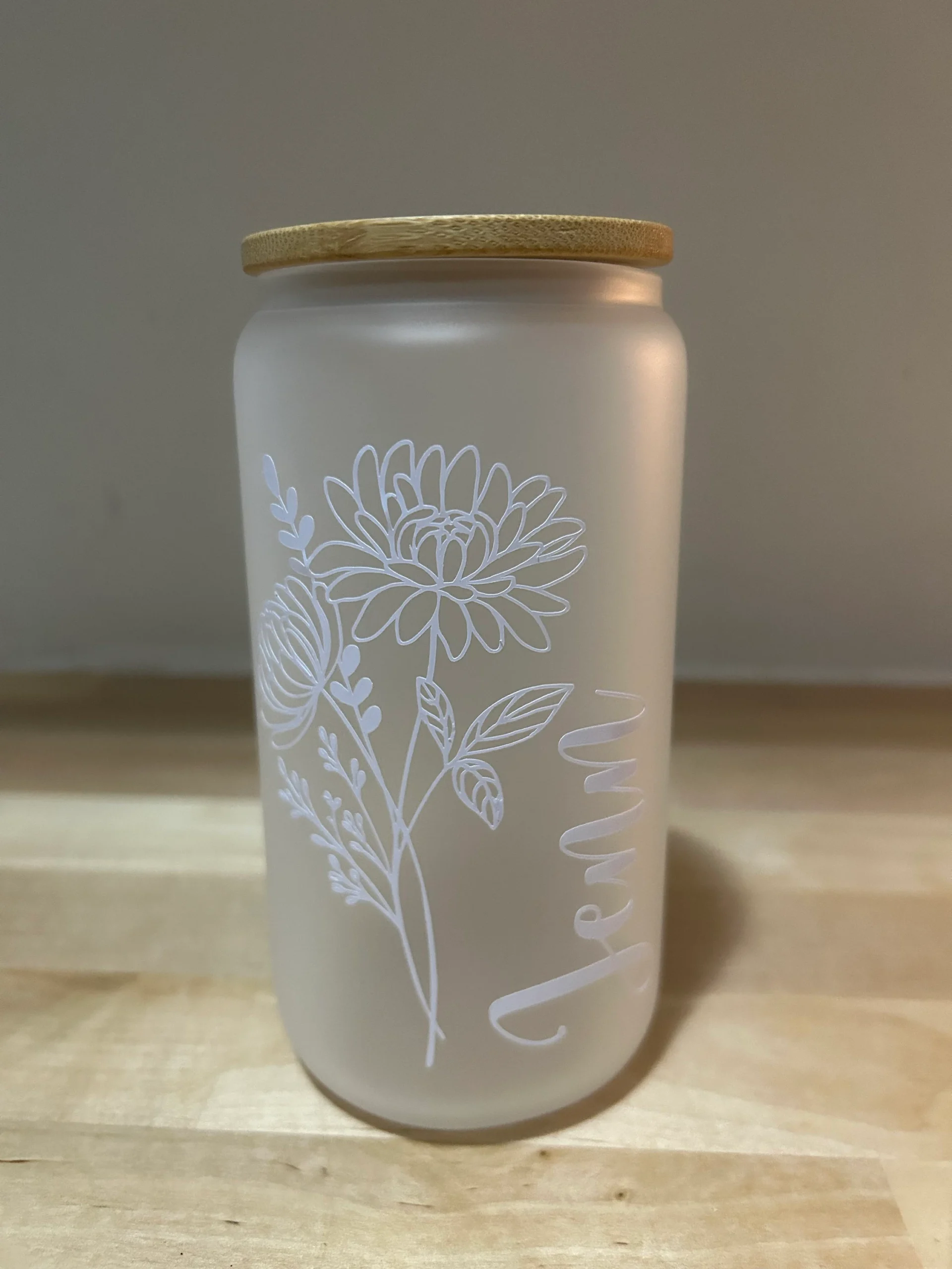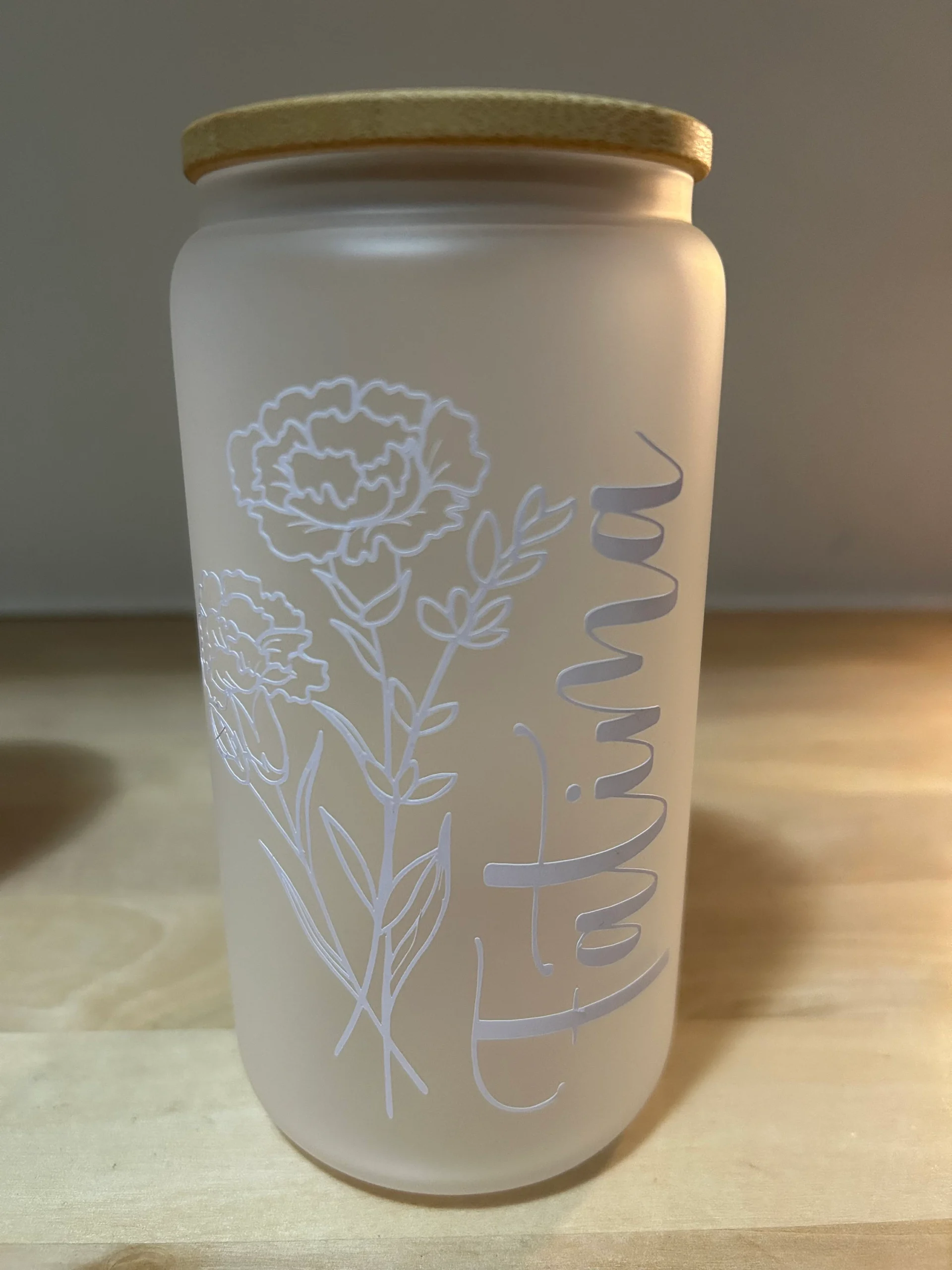 Frosted birth flower glass tumbler | 16oz glass coffee tumbler | Bridesmaid gift | Personalized cup