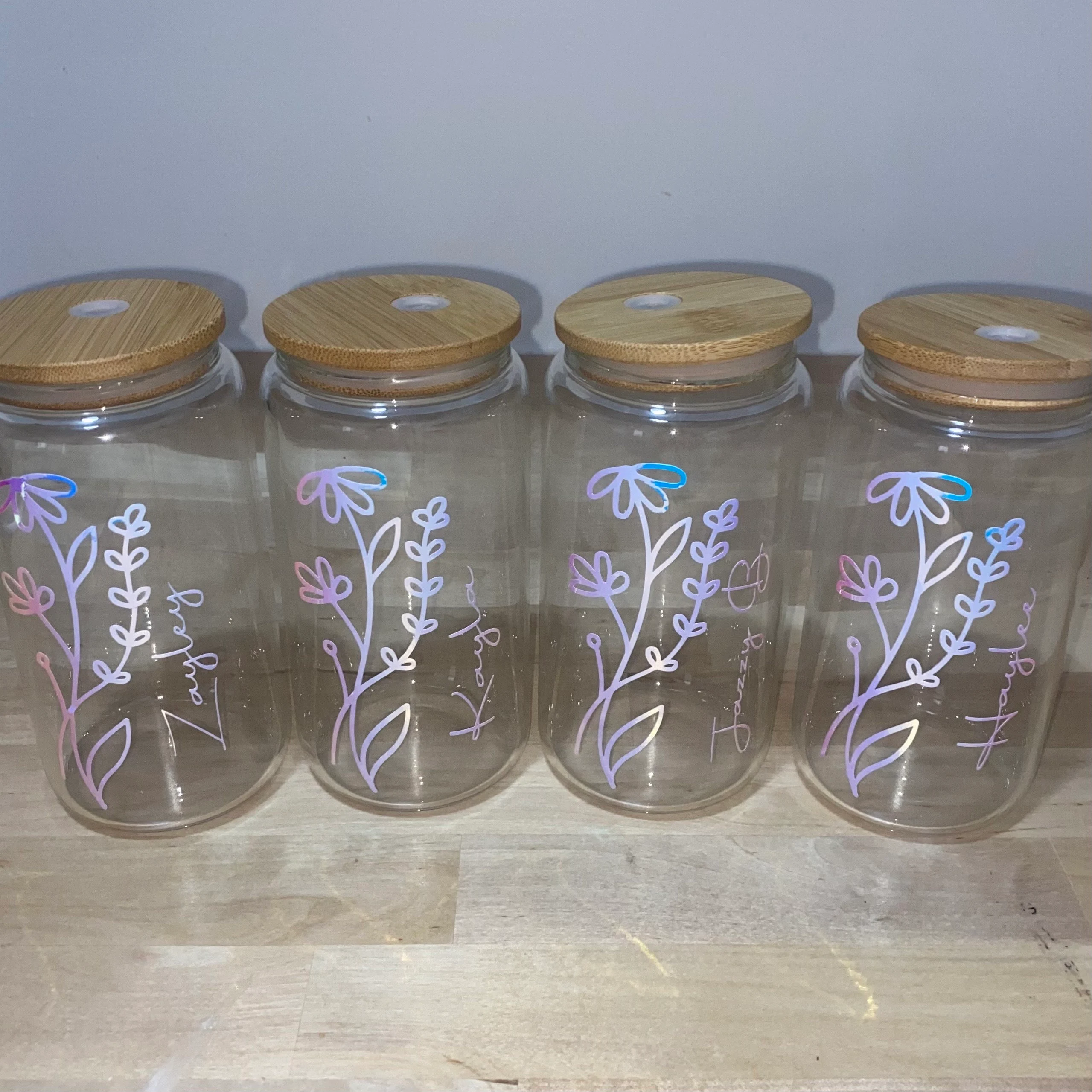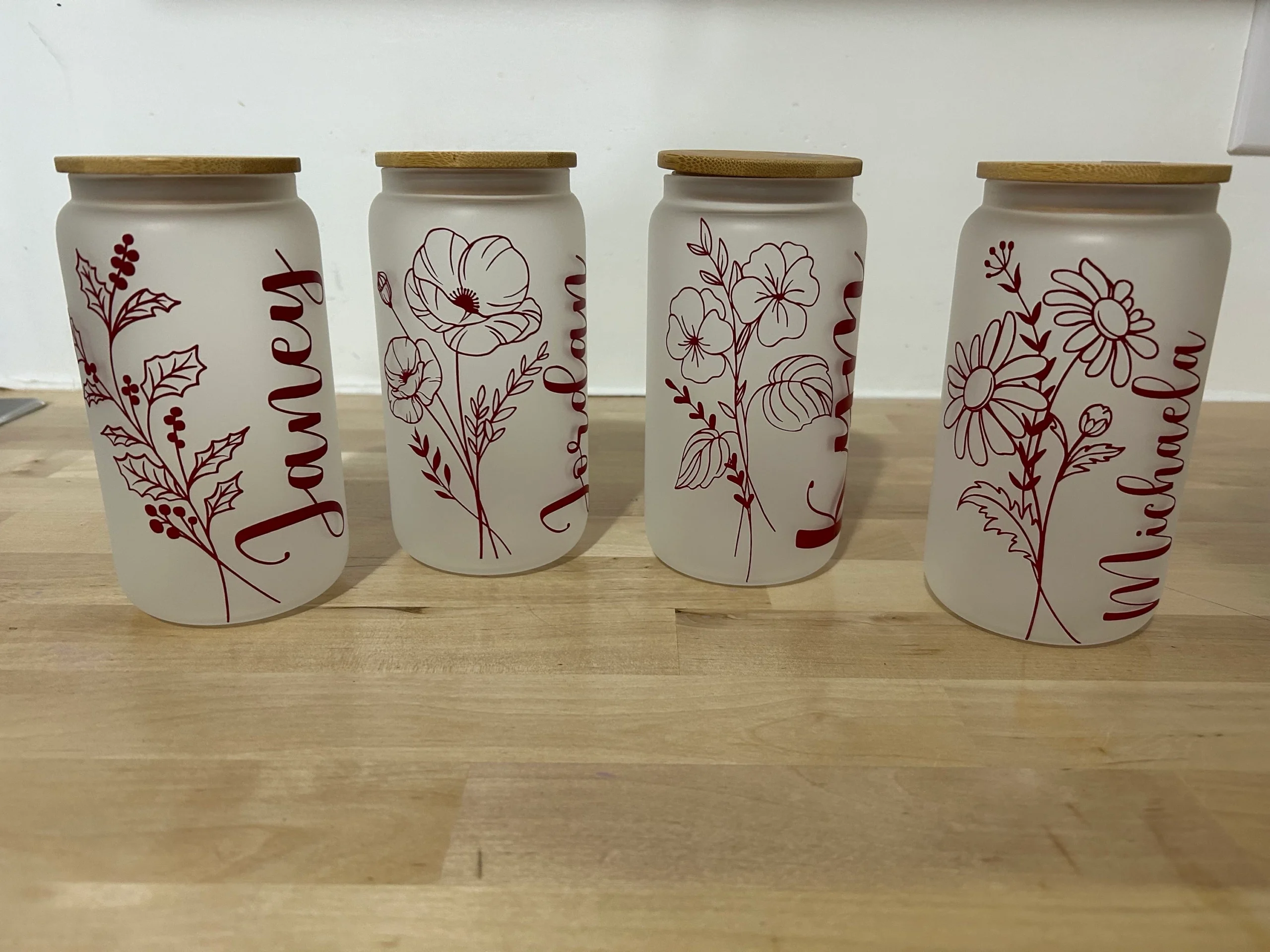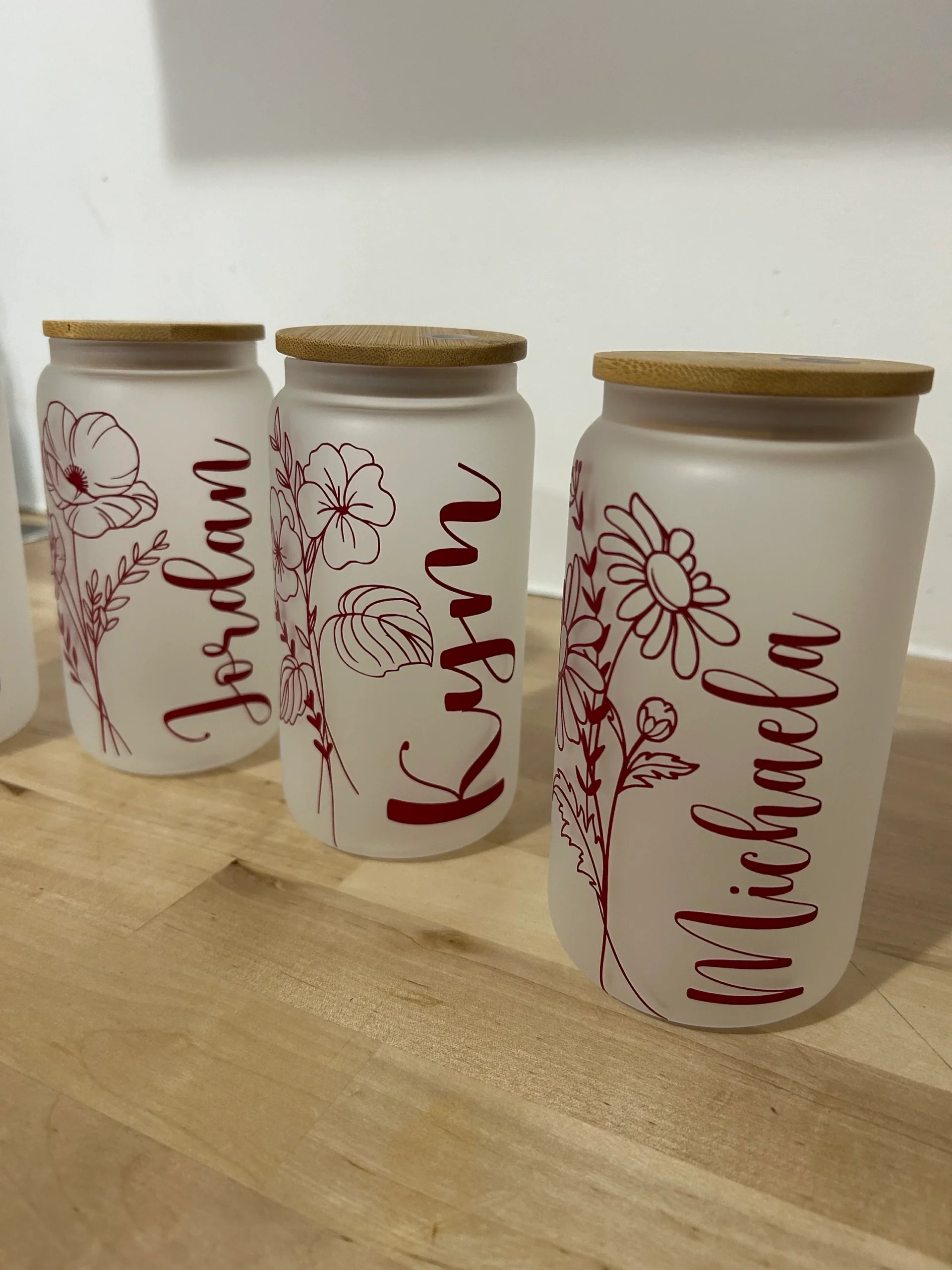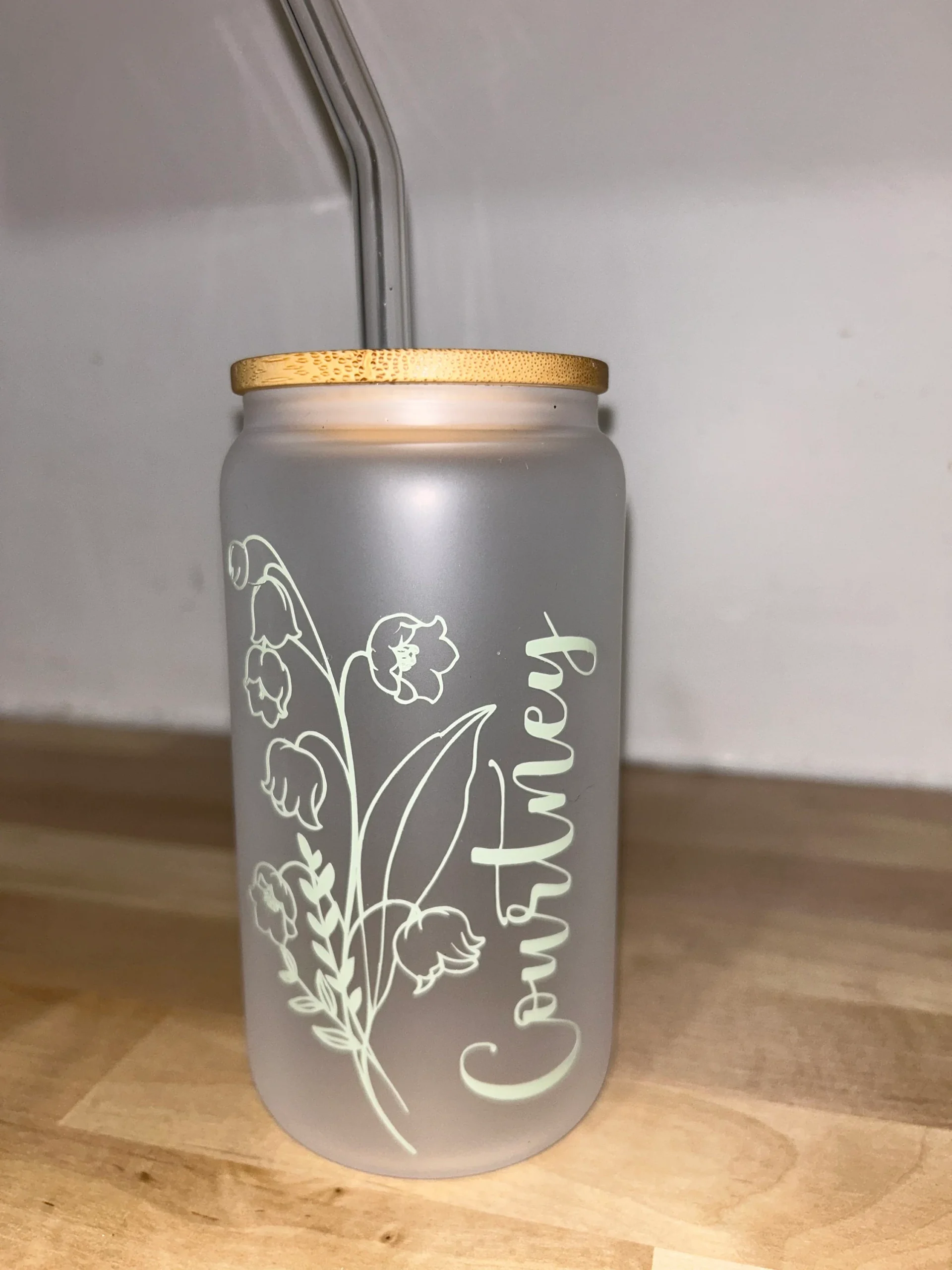 Frosted birth flower glass tumbler | 16oz glass coffee tumbler | Bridesmaid gift | Personalized cup
